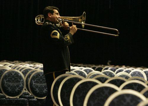 Jan 14, 2006; New York, NY, USA; Trombonist from the U.S. Army Blues Band Jazz Ensemble practices before a performance held during the 33rd Annual IAJE (International Association for Jazz Education) International Conference held at New York Sheraton and Hilton Hotels.